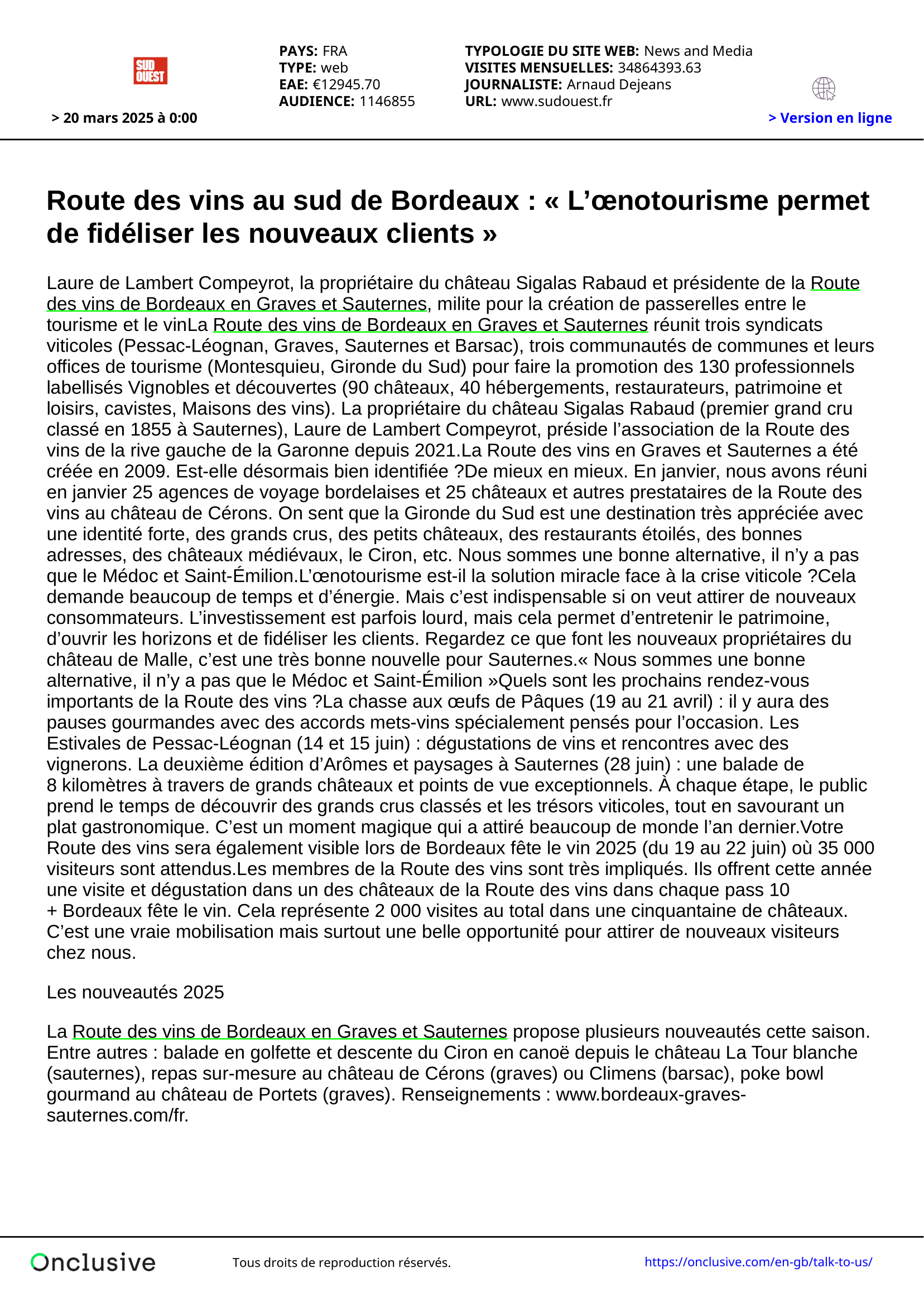Le Château Sigalas Rabaud et Laure de Lambert Compeyrot, en tant que présidente de la Route des vins de Bordeaux en Graves et Sauternes, poursuivent leur engagement pour promouvoir l’œnotourisme dans la Gironde du Sud. Avec plus de 130 professionnels labellisés, la Route des vins offre une alternative aux circuits classiques et dynamise l’attractivité de la région grâce à des événements uniques et des expériences immersives.